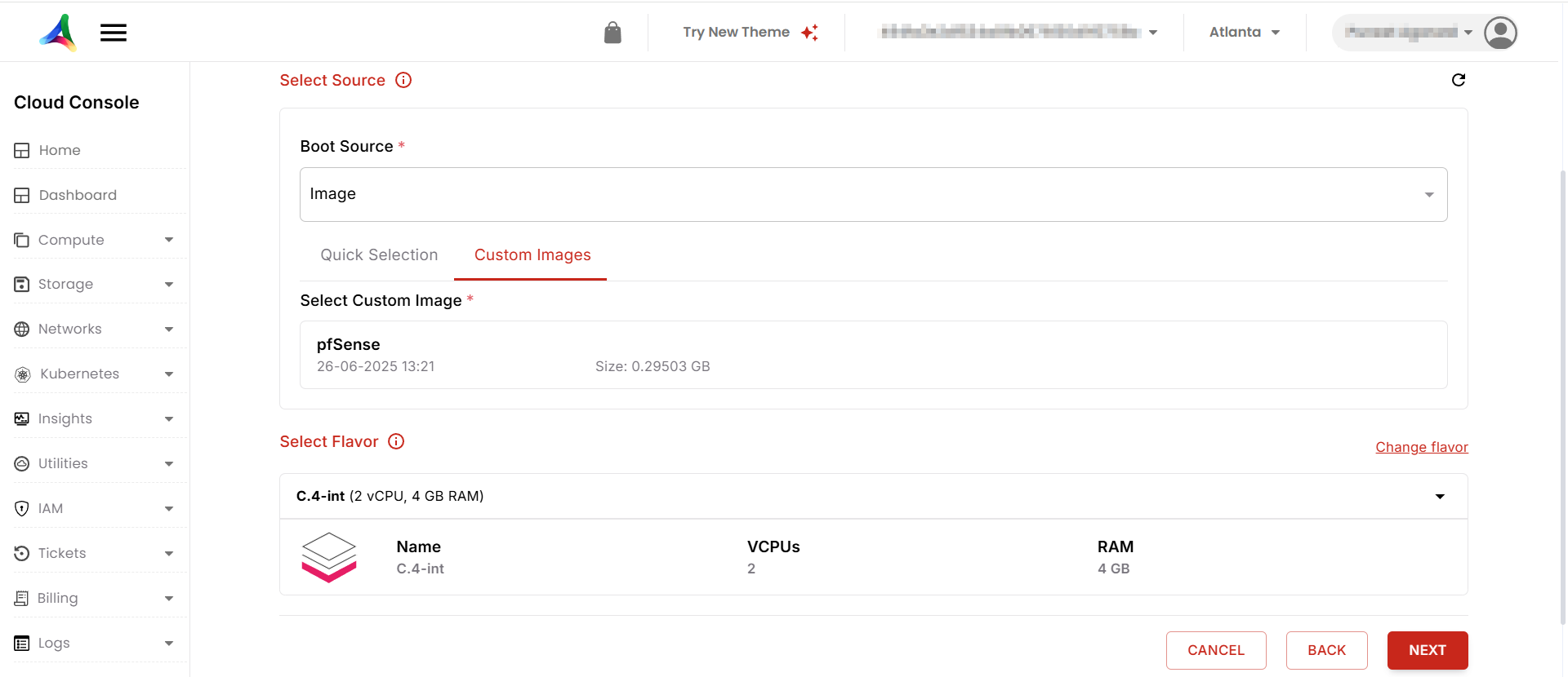 * **Source**: Choose Image and from custom Images, use the uploaded **pfSense ISO** image